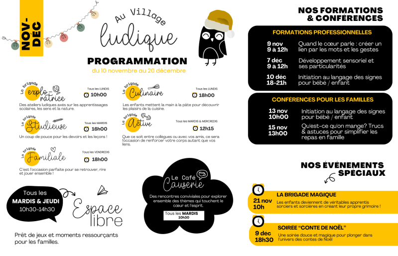 En plus de vous offrir une programmation d'ateliers diversifiés, nous avons le privilège d'accueillir des collaboratrices(teurs) et ou événements spéciaux pour répondre encore plus aux différents besoins de notre clientèle. Voici un aperçu des prochaines événements spéciaux au Village Ludique !